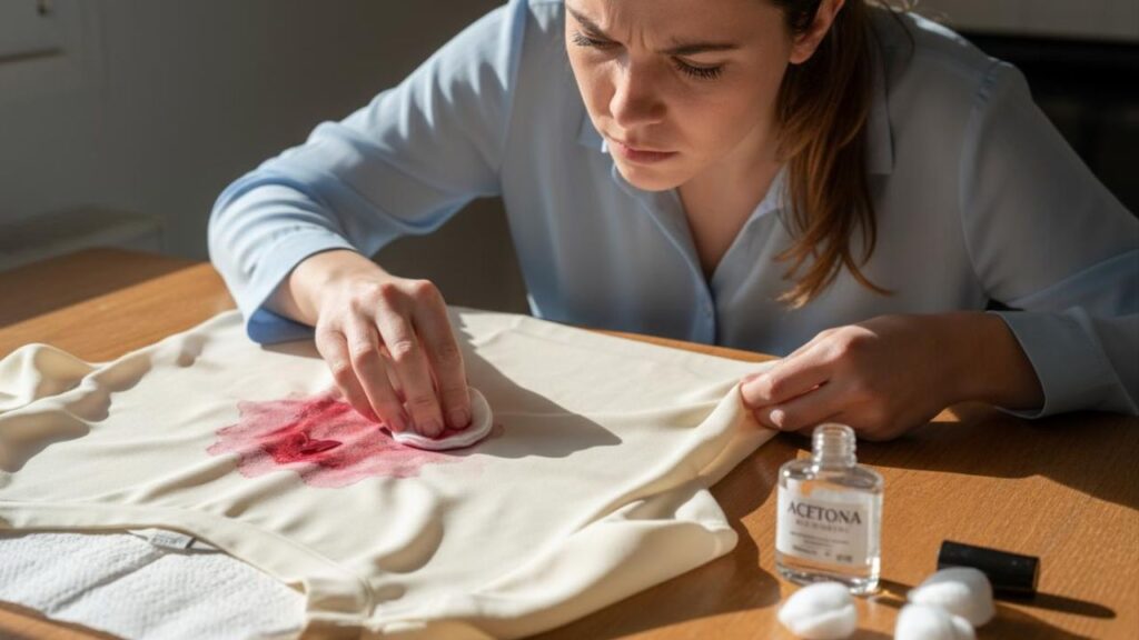 Após qualquer intervenção, deixe a área secar totalmente para evitar manchas de água e possíveis danos. Testar a acetona em áreas pouco visíveis é fundamental, principalmente com tecidos sintéticos ou delicados.