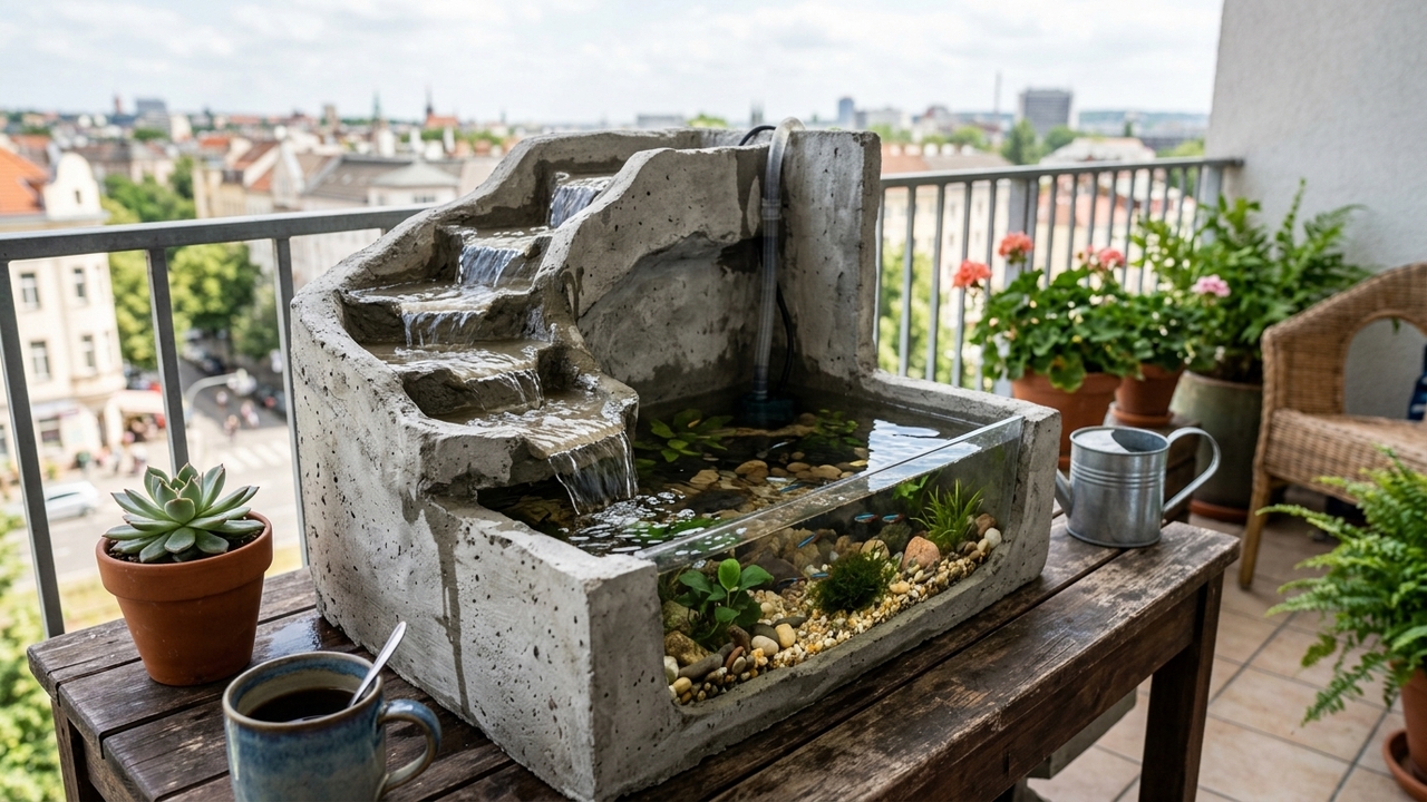 O que é um mini aquário de cimento com cachoeira infinita?
