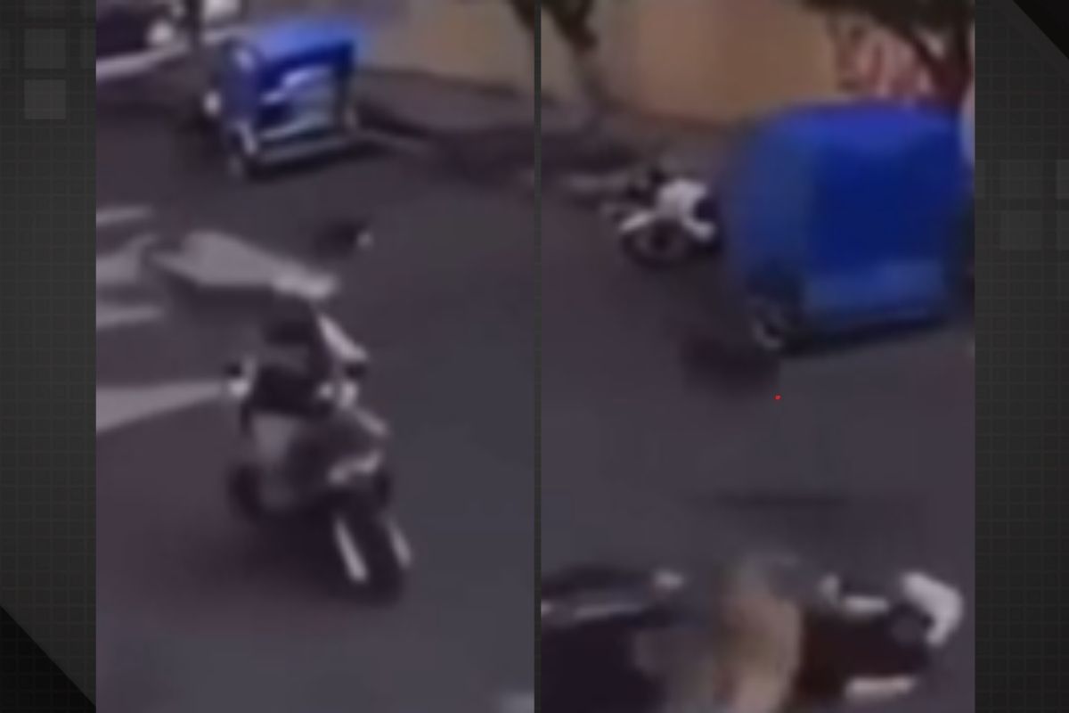 As imagens, registradas por uma câmera de segurança, mostram o exato instante em que o cão salta do alto e atinge em cheio o motociclista, que perde o controle e cai na rua. O piloto, visivelmente confuso, se levanta tentando entender o que havia acontecido, sem conseguir imaginar de onde o cachorro havia surgido.