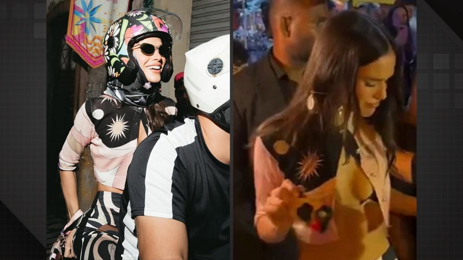 Vídeo: Bruna Marquezine chega de mototáxi e se joga em roda de samba no Centro