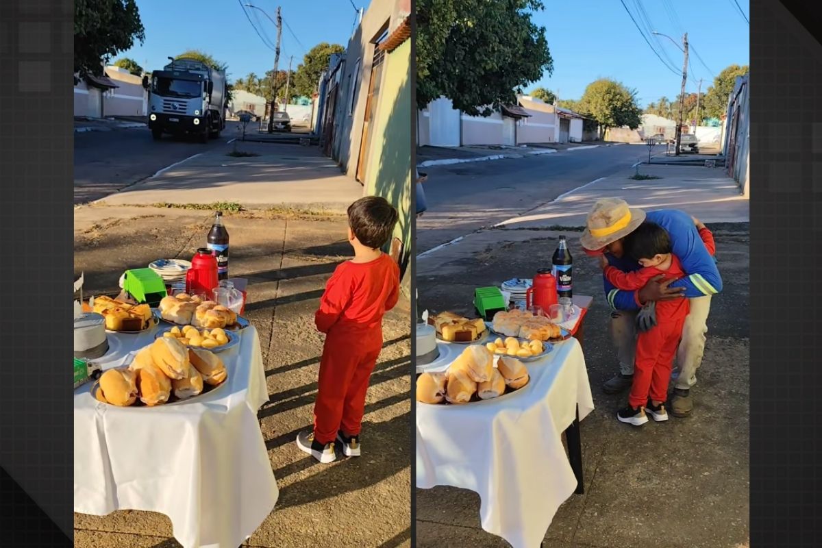 Neste ano, Davi fez um pedido especial: que a festa tivesse tema dos garis e que ele pudesse tomar café da manhã com eles. A mãe preparou a festa e, no momento da coleta, os profissionais foram surpreendidos pelo garotinho com bolo, pães, abraços e um sorriso sincero.