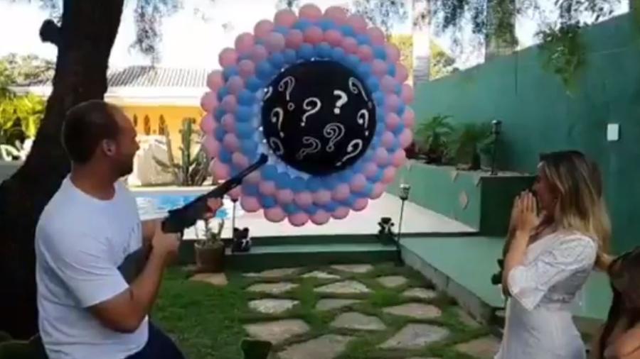 O deputado federal Eduardo Bolsonaro (PSL-SP) divulgou o vídeo da festa de revelação do sexo de seu primeiro bebê. O vídeo publicado neste domingo (10) mostra o filho do presidente Jair Bolsonaro atirando em um balão que tinha enfeites cor-de-rosa dentro, revelando que terá uma filha. No vídeo não é possível identificar se a arma é de verdade.