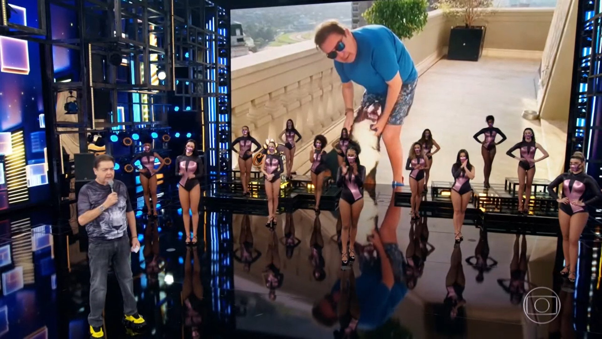 De volta aos estúdios da Globo, Faustão exibiu sequências gravadas na varanda da própria casa na estreia do quadro Cãopeão. “Meu companheiro de pandemia. Comporte-se”, disse.