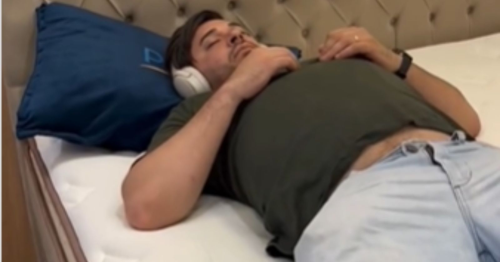Deitado em uma das camas expostas, o jovem parecia completamente à vontade, como se estivesse em sua própria casaUma cena inusitada chamou atenção em Guarulhos: um homem, de fones de ouvido, resolveu transformar a vitrine de uma loja de colchões em local para um cochilo tranquilo.