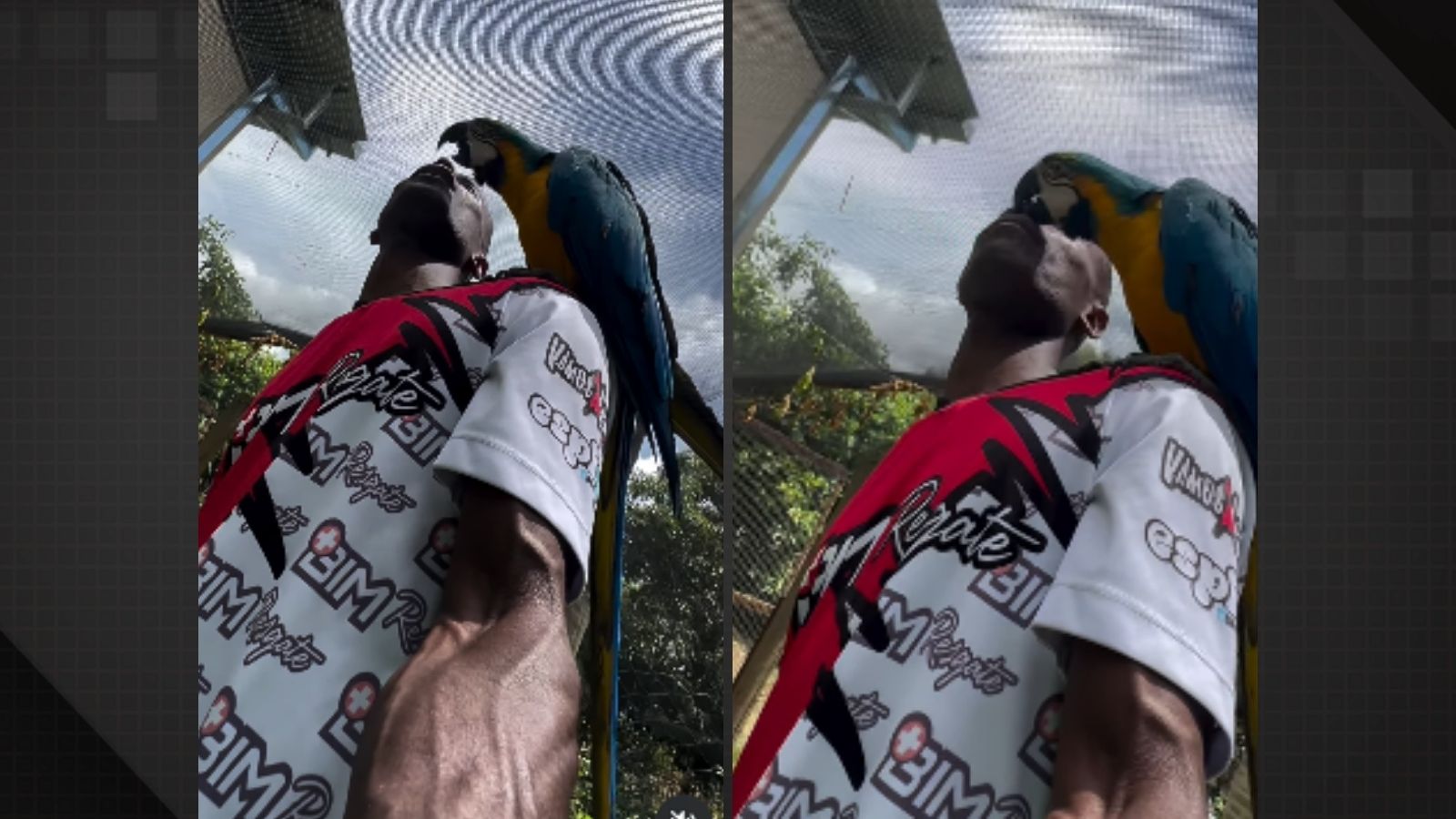 Assim que ele sobe na escada, as aves se aproximam e o cercam, impedindo qualquer avanço no reparo. No registro, é possível ver uma arara-azul e uma arara-canindé, que sobem em seus ombros, pedem carinho e fazem de tudo para chamar atenção.