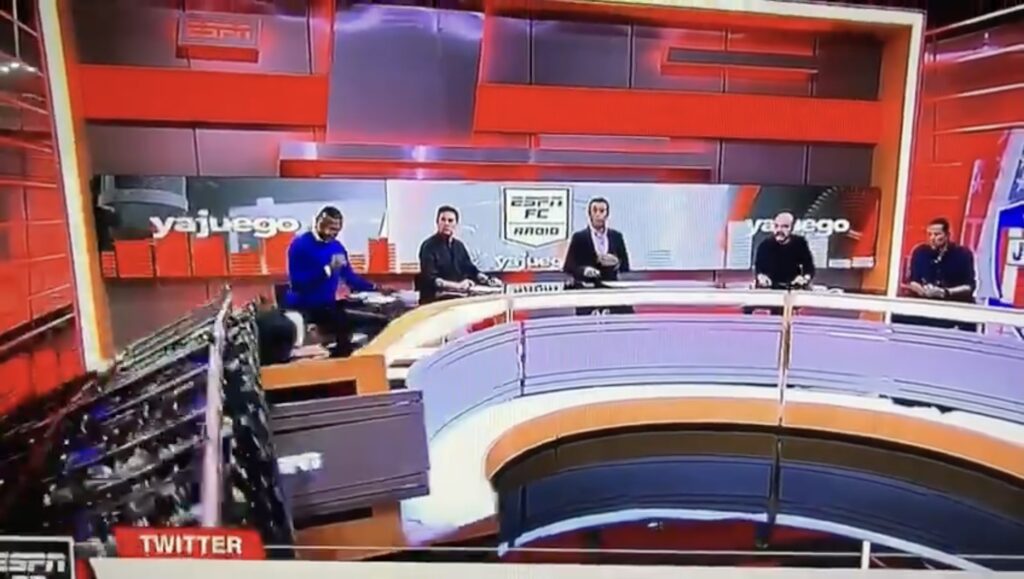 Algo inusitado aconteceu durante o ESPN FC Rádio, na Colômbia. O jornalista Carlos Orduz participava da atração quando foi atingido em cheio por um telão do estúdio.
