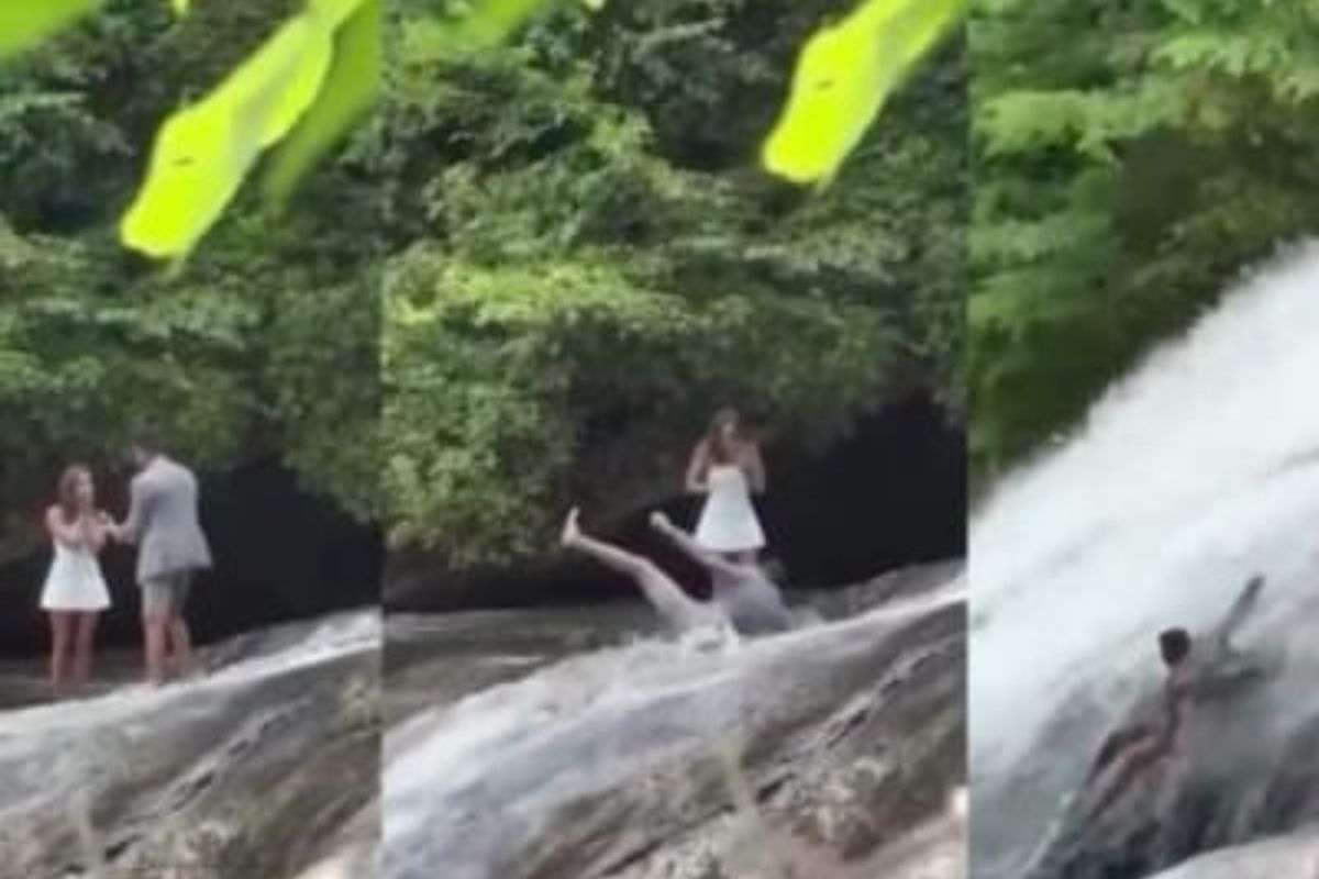 Vídeo: jovem escorrega em cachoeira ao pedir namorada em casamento