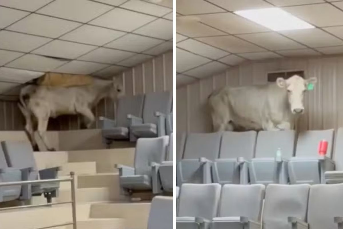 Uma vaca causou verdadeiro alvoroço ao tentar escapar de um leilão de gado no Arkansas, nos Estados Unidos, na última terça-feira (3). O animal surpreendeu o público ao correr desgovernadamente em direção às arquibancadas, escalar a estrutura e acabar quebrando parte do forro do teto do local.