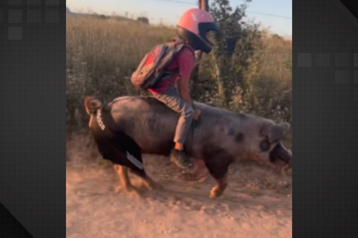 Vídeo: menino viraliza ao voltar da escola montado em porca