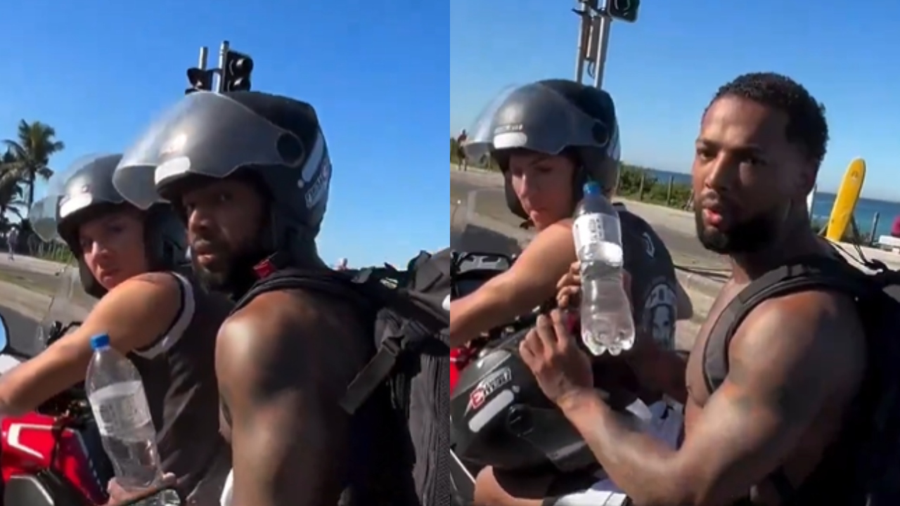 Nego do Borel levou um tapa na cabeça ao ser surpreendido enquanto estava na garupa de uma moto na orla da praia da Barra da Tijuca