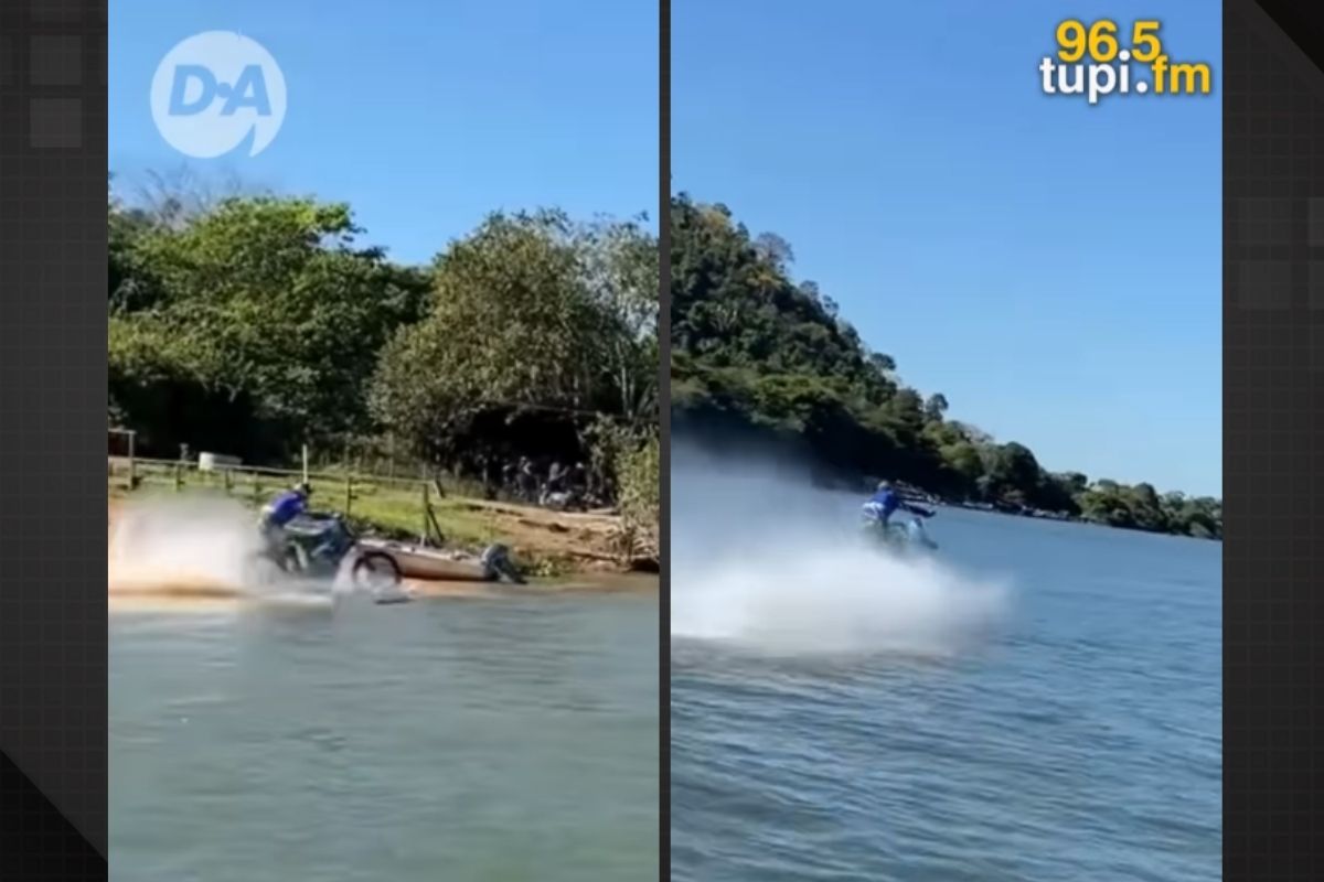 A cena foi registrada por moradores da Vila Taboca e mostra a moto deslizando sobre a água como se estivesse em uma prancha! Para isso, o piloto acoplou uma prancha na roda dianteira da moto, permitindo que ela literalmente “surfasse” sobre a superfície do rio.