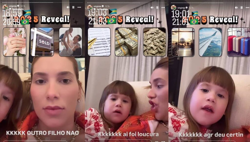 A previsão, que indicava símbolos como uma mão com aliança, uma casa à venda e um casal com um bebê, rendeu diversas brincadeiras. “Outro filho, não”, afirmou a esposa de Zé Felipe, enquanto interagia com os resultados do filtro junto com seus seguidores. O clima descontraído continuou quando Virginia também fez o teste de previsão com sua filha Maria Alice, gerando risadas e comentários leves.