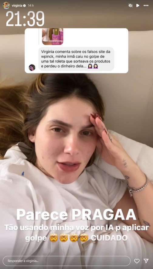 Ao responder a uma mensagem direta no Instagram, onde um seguidor relatou que sua irmã caiu em um golpe de um falso site da Wepink, Virginia fez um alerta: “Parece PRAGAA. Tão usando minha voz por IA [Inteligência Artificial] pra aplicar golpe. CUIDADO”, escreveu a influenciadora, demonstrando sua frustração com a situação.