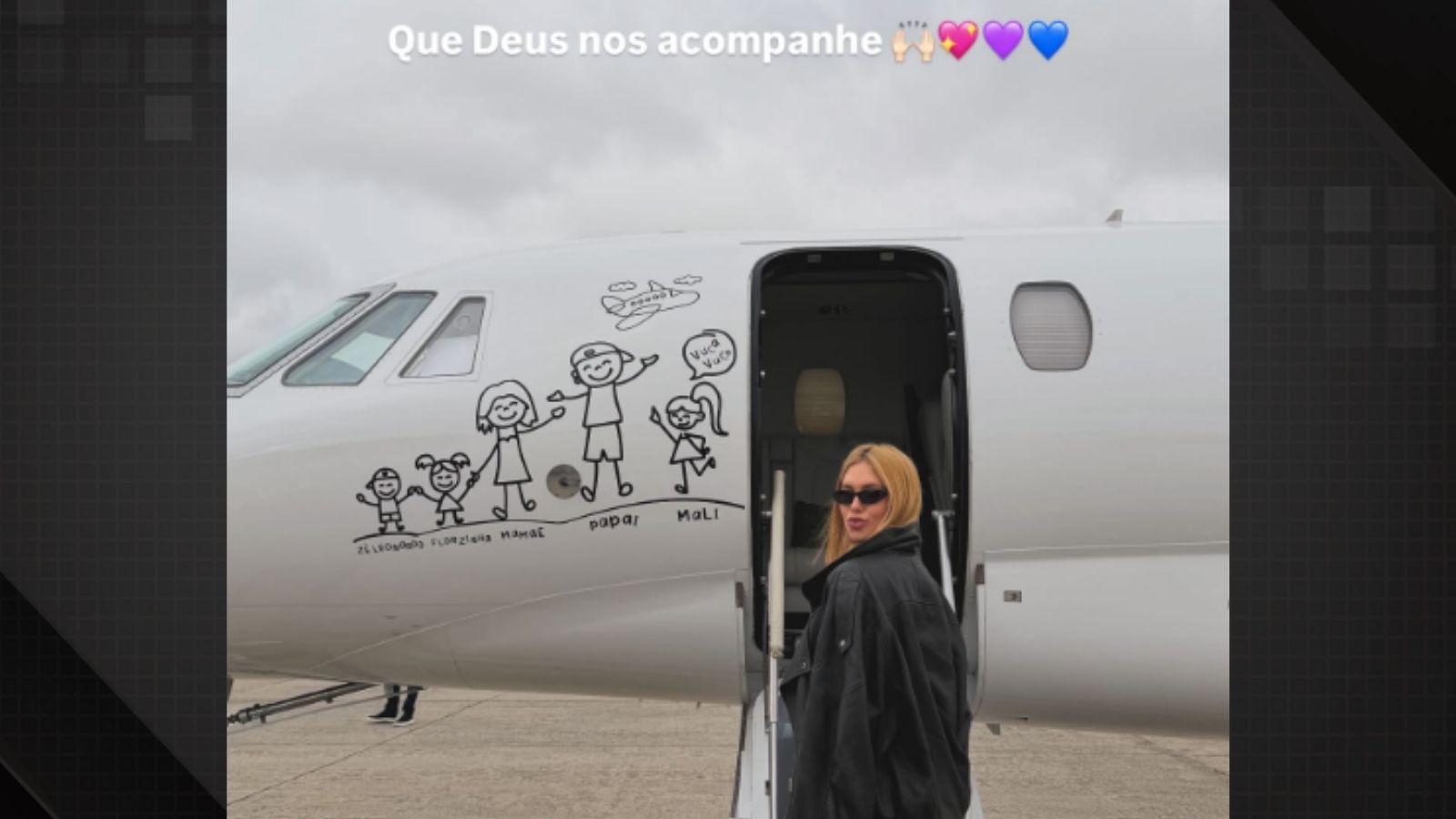 Pouco depois, Virginia publicou uma foto ao lado do jatinho particular que traz um desenho dela com as filhas e o ex-marido, Zé Felipe. O registro chamou atenção por manter a imagem do cantor na fuselagem, mesmo após o fim do relacionamento.