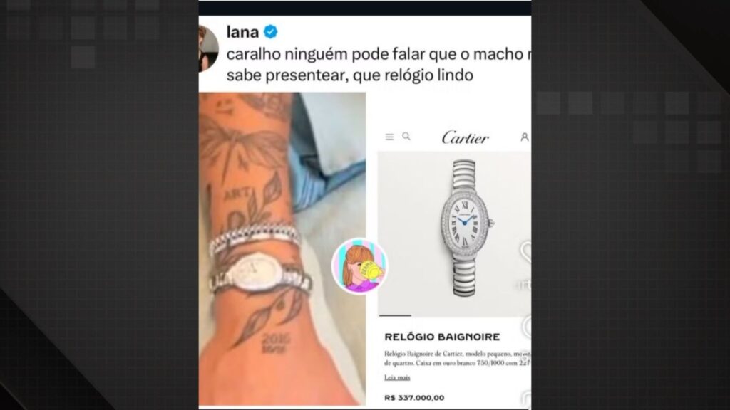 Ana mostrou nas redes sociais o modelo Baignoire, da Cartier, e destacou o valor da peça. A publicação revelava o acessório e o comentário da cantora: “Ninguém pode falar que o macho não sabe presentear, que relógio lindo”.