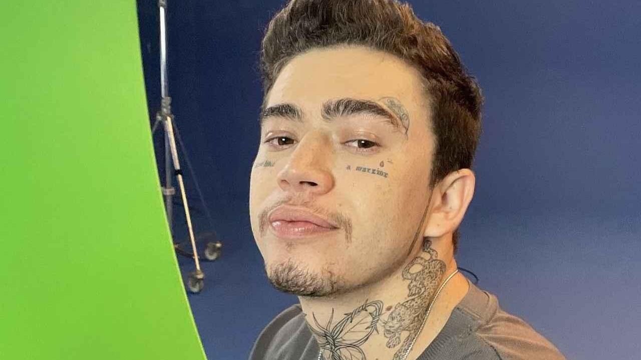 Whindersson Nunes sorrindo levemente, com tatuagens no rosto e pescoço, fundo verde e azul.
