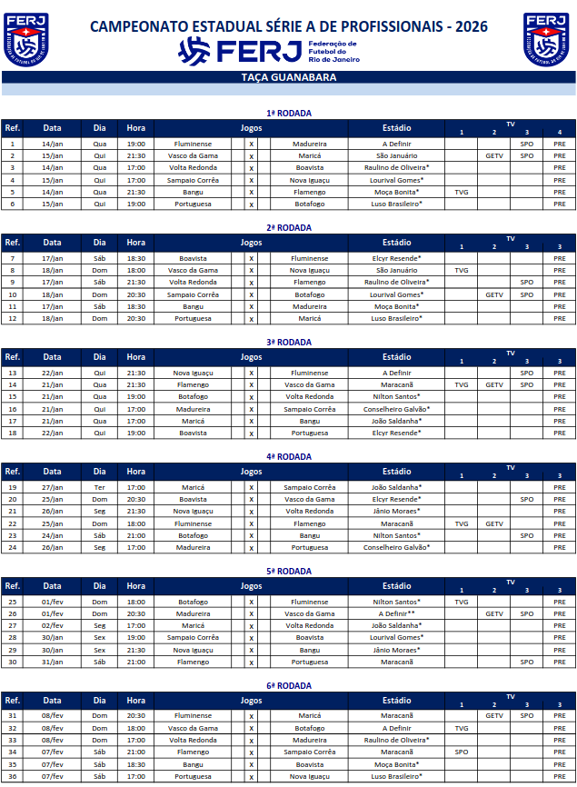 A tabela da Taça Guanabara foi divulgada oficialmente pela Ferj e já movimenta os bastidores do futebol carioca. Além das datas e horários, a entidade confirmou mudanças importantes no regulamento e definiu que o primeiro clássico do Campeonato Carioca será entre Flamengo e Vasco, no Maracanã, pela terceira rodada.