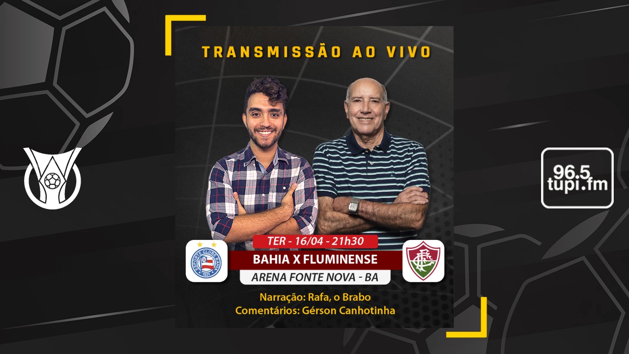 A Super Rádio Tupi transmite todas as emoções do jogo entre Bahia e Fluminense, a partir das 21h, com a narração de Rafa, o Brabo, e os comentários de Gerson Canhotinha de Ouro. As reportagens são de Wellington Campos e Sérgio Guimarães. Antes, às 20h, tem o Tupi na Rede com Vinicius Gama e Thiago Veras.