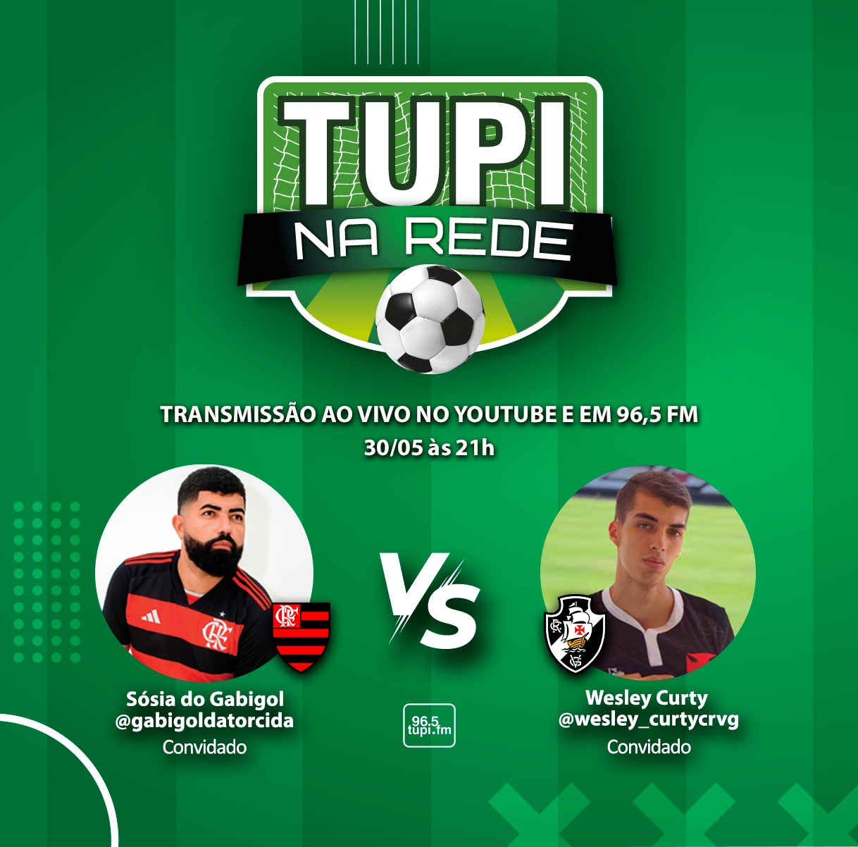 Nesta quinta-feira (30), o Clássico dos Milhões entre Vasco e Flamengo é o assunto do Tupi na Rede. Vinicius Gama e Marcos Coelho terão a companhia do Sósia do Gabigol e do vascaíno Wesley Curty para debater a partida de domingo, às 16h, no Maracanã. Você pode acompanhar a partir das 21h através do Youtube da Rádio Tupi ou pelo 96,5 fm.