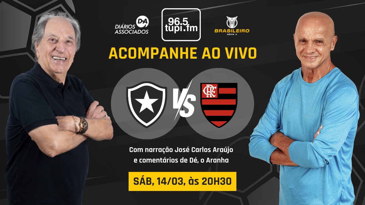 Não perca nenhum detalhe de Botafogo x Flamengo ao vivo na transmissão completa da Super Rádio Tupi. A jornada esportiva começa às 18h e acompanha todos os lances de mais um grande clássico do futebol brasileiro.