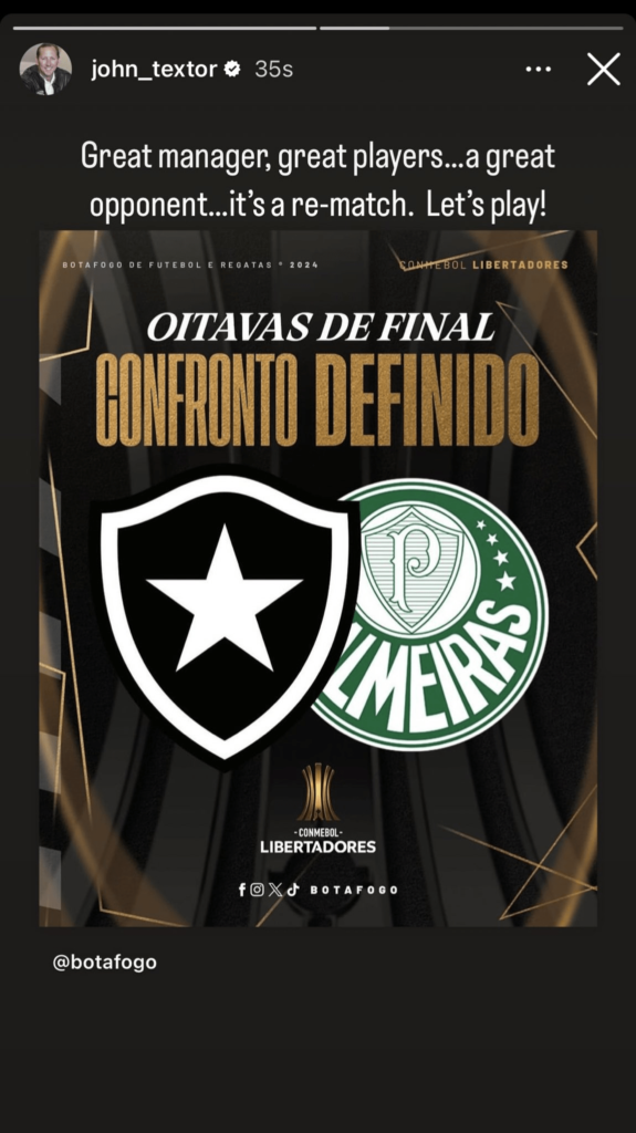 Minutos depois da definição do adversário alvinegro nas oitavas da Libertadores, John Textor, dono da SAF do Botafogo, utilizou as redes sociais para comentar sobre o resultado do sorteio realizado na sede da Conmebol, em Luque, no Paraguai, na tarde desta segunda-feira (03).