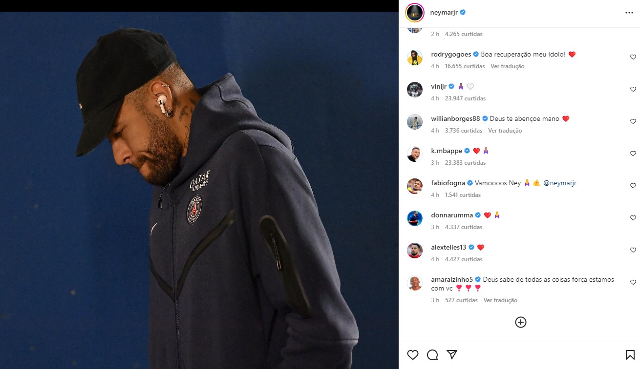 O atacante recebeu apoio de diversos companheiros de equipe, como o francês Mbappé, além dos brasileiros Vini Jr e Rodrygo, com quem atua na seleção brasileira. “Boa recuperação meu ídolo”, disse o ex-Santos.