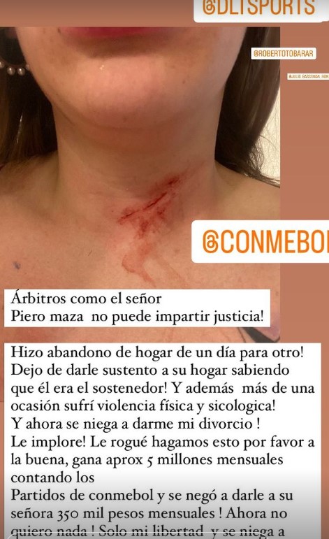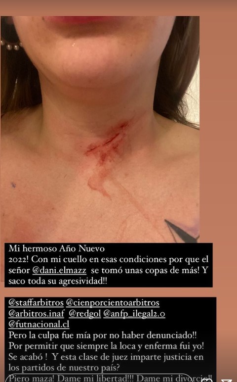 “Meu lindo ano novo 2022. Com meu pescoço nessas condições porque ele resolveu tomar umas bebidas a mais e mostrou toda a sua agressividade. A culpa é minha por não ter denunciado. Por permitir que eu sempre saia como louca. Acabou. É essa a classe de juiz que decide a justiça nas partidas do nosso país? Eu peço, me dê liberdade. Eu quero meu divórcio.” – declarou.