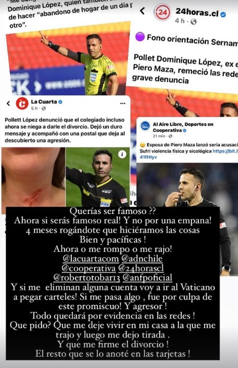 O chileno Piero Maza, árbitro principal do jogo de ida da Recopa Sul-Americana, entre Independiente Del Valle e Flamengo, foi acusado pela ex-esposa de cometer violência doméstica. Pollett Dominique postou em suas redes sociais fotos das supostas agressões cometidas.