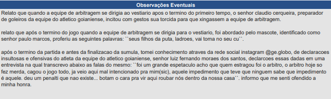 O jogo entre Flamengo e Atlético-GO gerou polêmicas durante os 90 minutos mas também ao final da partida. Na súmula, o árbitro Andre Luiz Skettino relatou que foi xingado pelo mascote da equipe goiana, além de ofensas por parte do preparador físico da equipe e do atacante Luiz Fernando.