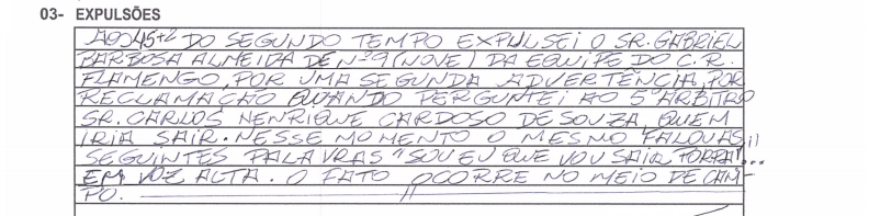 Foi conhecida publicamente a razão da expulsão de Gabigol, no último lance do Fla-Flu deste domingo, no Maracanã, pelo jogo de ida da final do Campeonato Carioca. Wagner do Nascimento Magalhães, árbitro da partida, relatou em súmula o que foi dito pelo atacante momentos antes do fato e justificou a expulsão pela reclamação e pelas palavras ditas pelo camisa 9. Confira a reprodução da súmula, disponibilizada no site da Ferj: