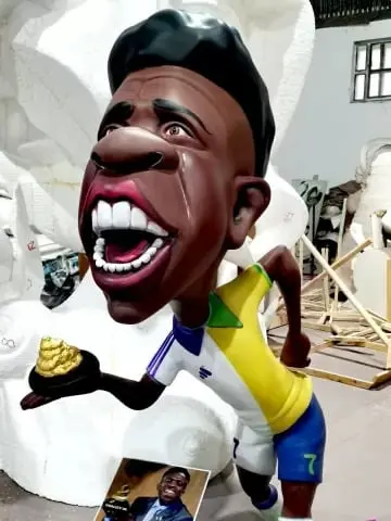 A estátua de Vini Jr. tem cerca de dois metros e está exposta no Fallas de Valência, uma das festas mais populares da Espanha, deste ano. O boneco do brasileiro veste uma camisa metade Real Madrid metade Seleção Brasileira, enquanto segura um cocô dourado. A placa que acompanha a obra conta com uma foto do jogador chorando.