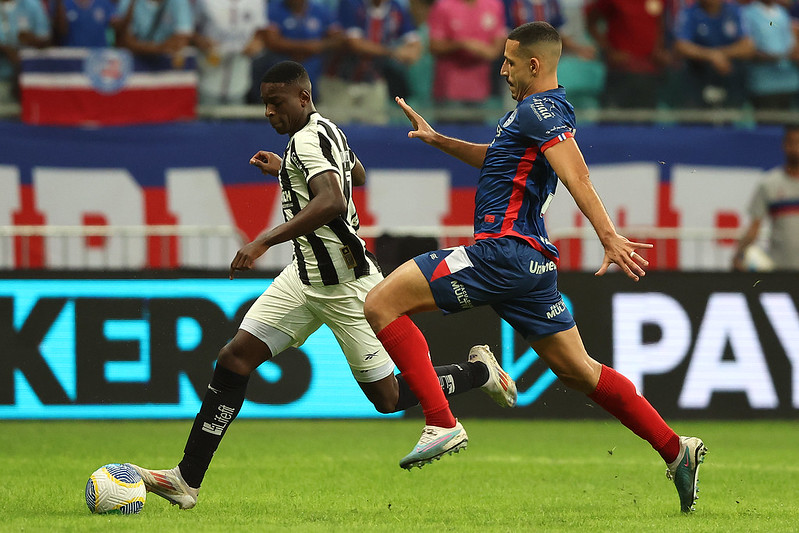 Agitado, o primeiro tempo não teve gol, mas demonstrou superioridade do Alvinegro, que criou as melhores chances. Especialmente em jogadas com Luiz Henrique. Já o Tricolor de Salvador até começou bem a partida, só que sem tanta pressão, escapando muito com Santiago Arias pela direita. No geral, os cariocas mereceram abrir o placar pelo volume ofensivo.