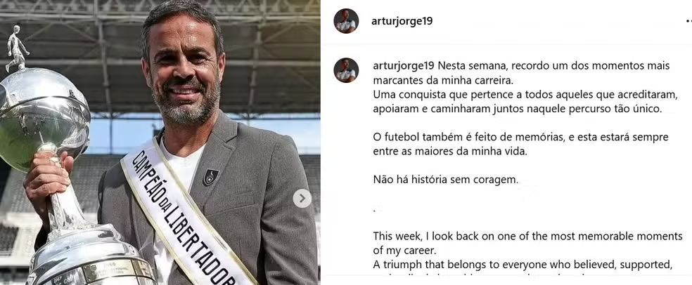 Antes mesmo do dia 30 de novembro, o técnico Artur Jorge, ex-Botafogo, já abriu as comemorações de um ano do título histórico da Libertadores à frente do clube. Nas redes sociais, ele publicou uma mensagem onde trata o feito como um dos momentos mais marcantes da carreira.