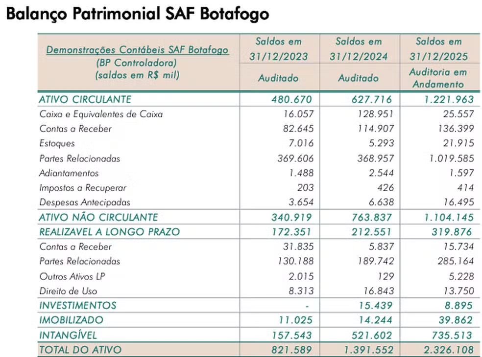 O Botafogo divulgou neste sábado um laudo que acende o alerta para a situação financeira da SAF. Além disso, o documento, elaborado pela Meden Consultoria e apresentado junto à convocação de Assembleia Geral Extraordinária por John Textor, aponta passivo circulante de cerca de R$ 1,6 bilhão. Esse valor precisa ser quitado em até 12 meses. O clube também registrou prejuízo de R$ 287 milhões em 2025.