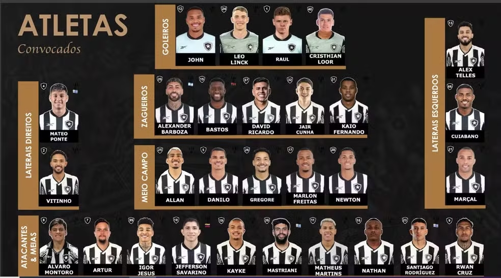 As novidades importantes na relação estão também no trio de reforços recentes que o Alvinegro anunciou. Casos do goleiro Cristhian Loor, do zagueiro Kaio Pantaleão e do meia Álvaro Montoro. Os novos atletas ficam à disposição do técnico Renato Paiva para a disputa da Copa do Mundo de Clubes. Veja a lista abaixo: