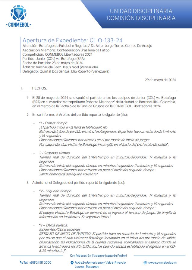 A Conmebol notificou na última quarta-feira (28) o Botafogo e o técnico Artur Jorge por infração cometida na Libertadores na partida entre Botafogo e Junior Barranquilla, na Colômbia. Os motivos das possíveis punições foram atrasos na entrada em campo e na volta do intervalo.