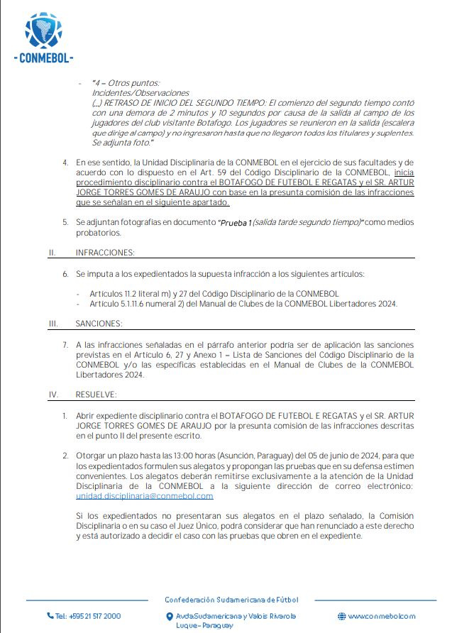 O Manual de Clubes prevê inicialmente advertência, porém como houve dois atrasos na mesma partida há possibilidade de multa. O valor pode chegar até a US$ 50 mil (R$ 260 mil). A infração teria sido em dois artigos do Código Disciplinar da CONMEBOL (artigo 11.2, letra “m”, e artigo 27), e um do Manual de Clubes da CONMEBOL Libertadores 2024 (artigo 5.1.11.6, número 2). Veja abaixo o documento.