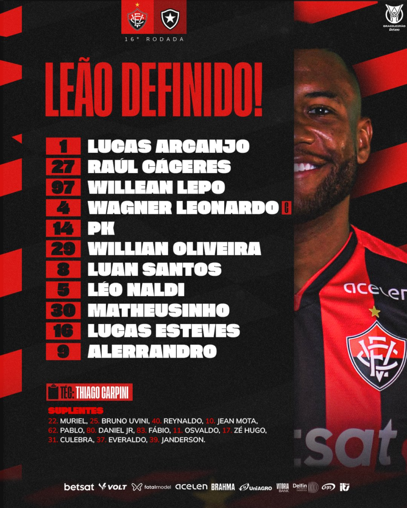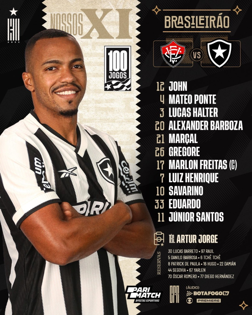 Nesta quinta-feira (11), o Botafogo enfrenta o Vitória com mudanças no time titular, no Barradão, pela 16ª rodada do Campeonato Brasileiro, às 21h30. Mateo Ponte, Lucas Halter, Marçal, Gregore e Savarino entram nos lugares de Damián Suárez, Bastos, Cuiabano, Danilo Barbosa e Tiquinho Soares.