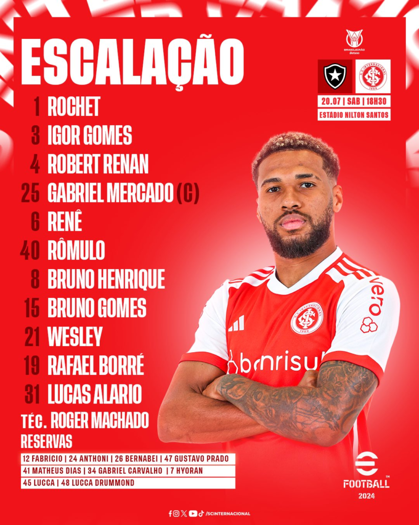 O Botafogo está pronto para enfrentar o Internacional, no estádio Nilton Santos, às 18h30. Com Igor Jesus no time titular, Artur Jorge colocou o time com quatro atacantes para buscar a vitória e se manter na liderança.