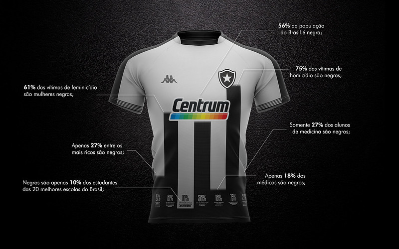 Em parceria com o Centrum, o Botafogo lançou campanha e camisa no combate ao Racismo. A campanha é denominada: “Racismo: o vírus da desigualdade estrutural”, uma iniciativa importante e necessária contra o racismo. O Glorioso entrará em campo neste domingo contra o Brasil de Pelotas, às 16h, no estádio Bento de Freitas, pela 37ª rodada do Campeonato Brasileiro Série B, com uma camisa alusiva ao Dia da Consciência Negra. No uniforme, as tradicionais faixas alvinegras se tornam gráficos que evidenciam a desigualdade racial e os efeitos do racismo na saúde da população negra.