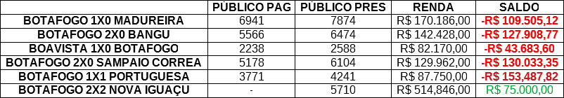 Esse foi o primeiro resultado financeiro positivo do Botafogo na Taça Guanabara. As partidas contra Madureira, Bangu, Sampaio Correa e Portuguesa tiveram saldo negativo. O Alvinegro também teve prejuízo na partida em Bacaxá, contra o Boavista. Confira.