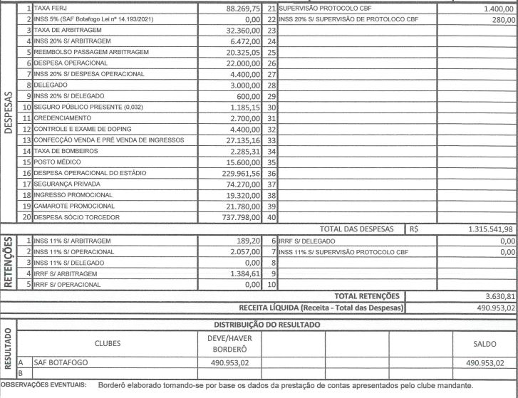 Despesa registrada foi de R$ 1.315.541,98. Taxa de arbitragem e Ferj, operacional do estádio e sócio-torcedor são as maiores