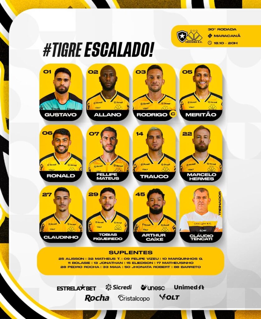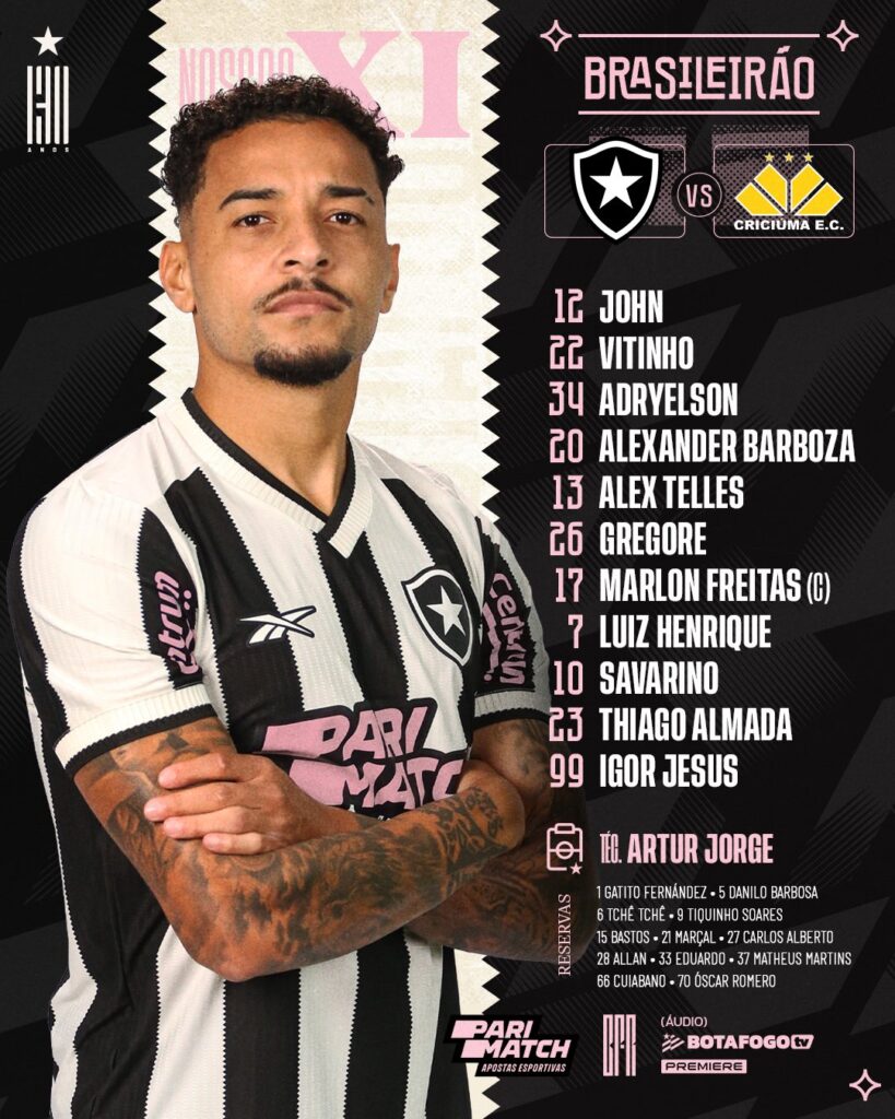 Botafogo está escalado para enfrentar o Criciúma pelo Brasileirão
