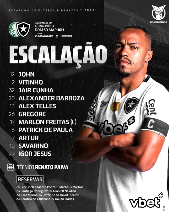 Botafogo está escalado para estreia no Brasileirão contra o Palmeiras