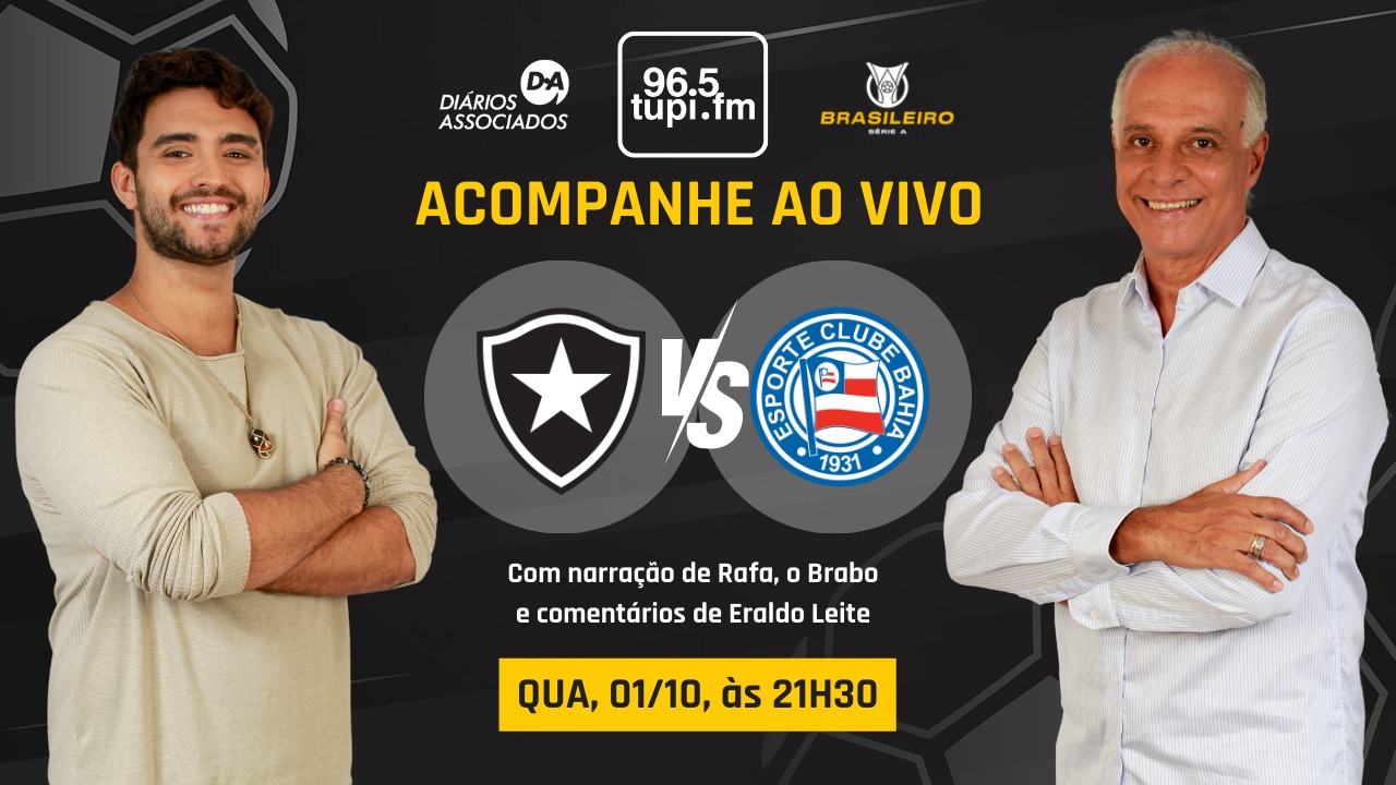 Neste quarta-feira (1), Botafogo e Bahia se enfrentam no estádio Nilton Santos em duelo válido pela 26ª rodada do Campeonato Brasileiro Série A. A bola rola às 21h30, e a Super Rádio Tupi inicia a transmissão às 20h30. A narração será de Rafa, o Brabo, com os comentários de Eraldo Leite. Dessa forma, o torcedor acompanha todos os detalhes de Botafogo x Bahia ao vivo.