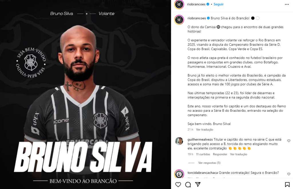Após se tornar SAF neste ano, o Rio Branco, do Espírito Santo, tem anunciado reforços para a próxima temporada. Na última quinta-feira (10), o clube confirmou acordo com o volante Bruno Silva, campeão da Copa do Brasil e do Campeonato Mineiro pelo Cruzeiro em 2018. Aos 38 anos, ele chega para vestir a camisa 8 do Rio Branco. Além da Raposa, o meio-campista defendeu Botafogo, Fluminense, Internacional, Athletico-PR e Bahia.