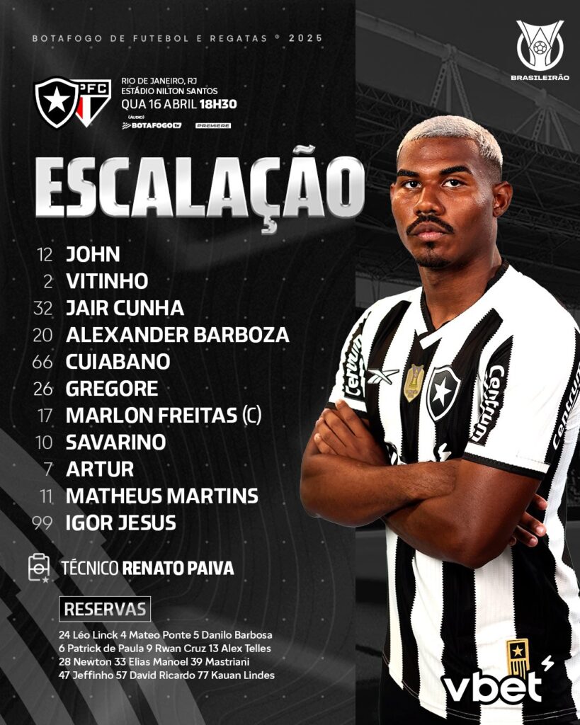 Nesta quarta-feira (16), o Botafogo enfrenta o São Paulo pela quarta rodada do Campeonato Brasileiro, no Nilton Santos, às 18h30. O Glorioso terá as entradas de Cuiabano e Matheus Martins nos lugares de Alex Telles e Patrick de Paula.
