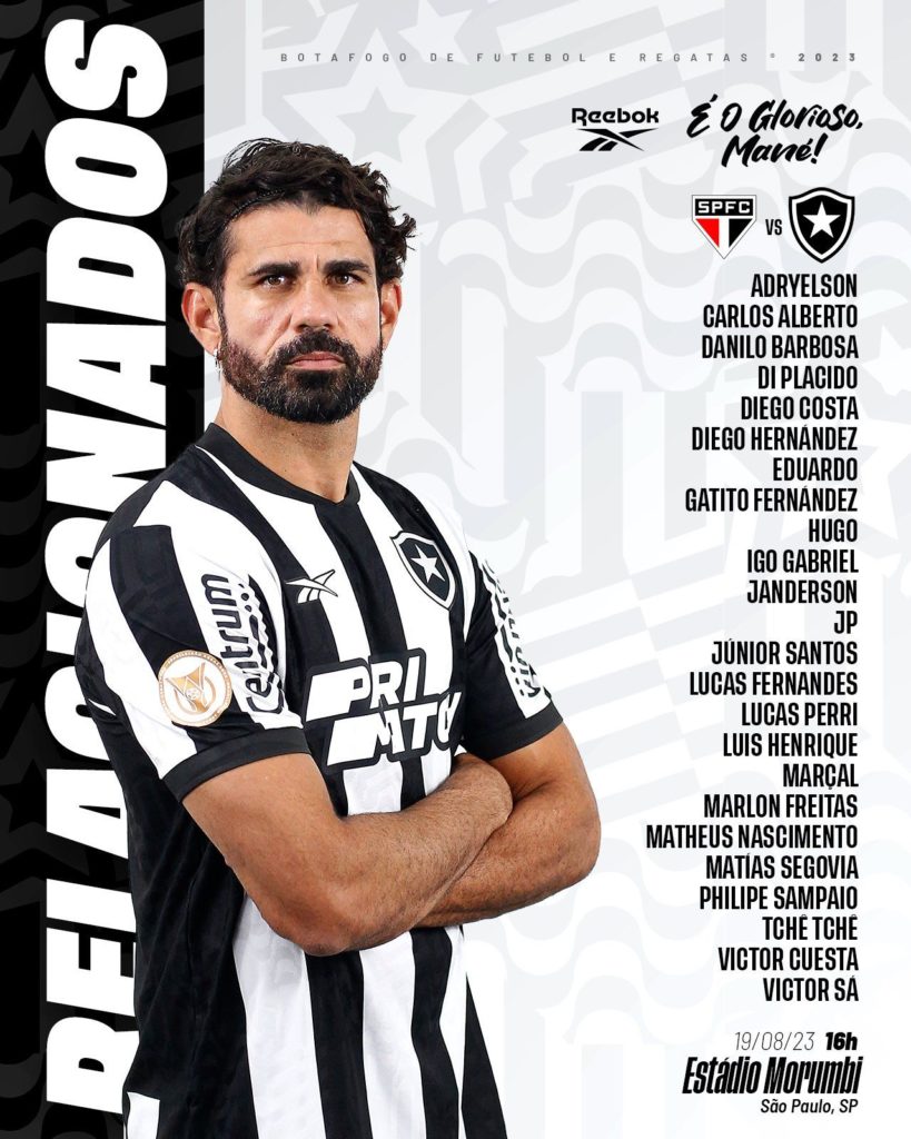 Com Diego Costa, Botafogo divulga lista de relacionados para jogo contra o São Paulo