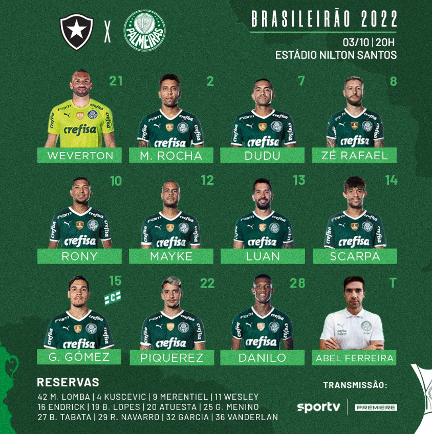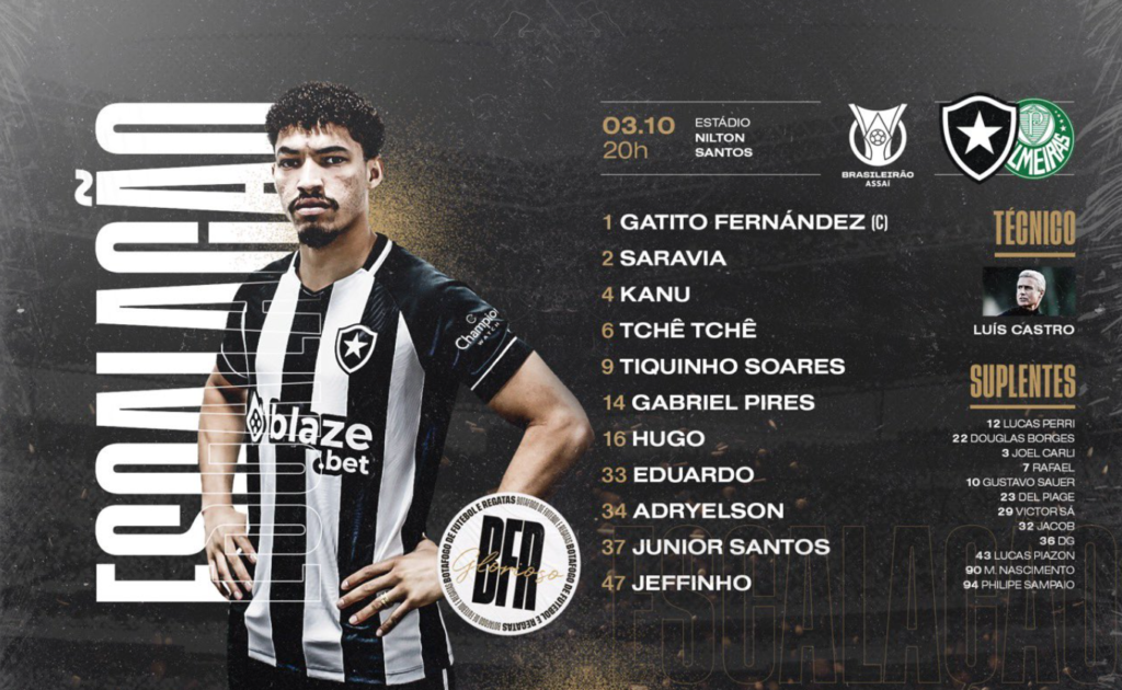 Com Kanu, Hugo e Jeffinho, Botafogo está escalado para o duelo diante do Palmeiras