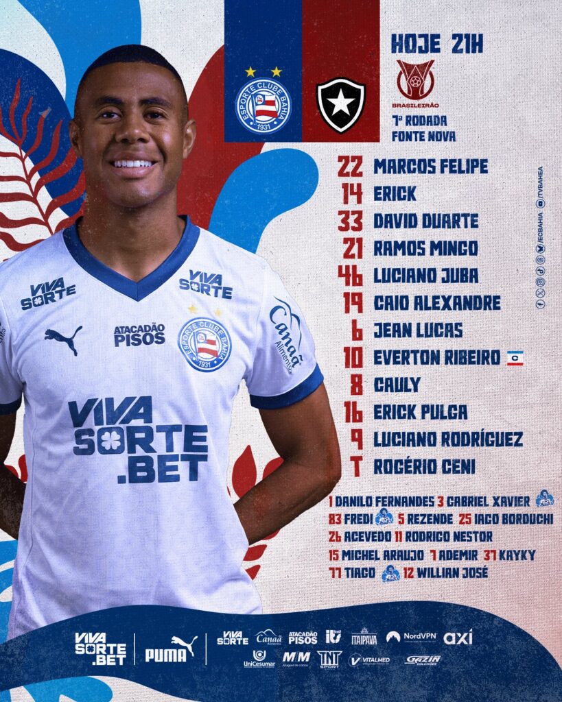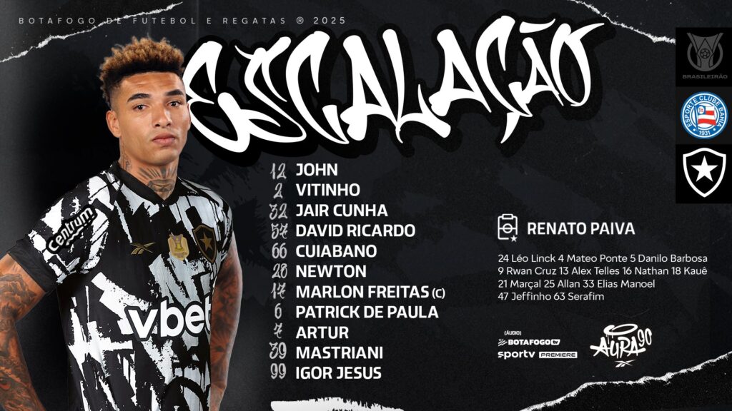 O Botafogo encara o Bahia neste sábado (3), às 21h, na Arena Fonte Nova, pela sétima rodada do Brasileirão Série A. O técnico Renato Paiva promoveu algumas mudanças entre os titulares em relação ao clássico contra o Fluminense na última rodada. David Ricardo, Newton, Patrick de Paula e Artur entram nos lugares de Barboza, Gregore, Savarino e Matheus Martins.